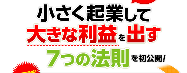 そして、その具体的な法則を、私は全7回のメールセミナーにまとめ、 「小さく起業して、大きな利益を出す7つの法則」と題して、あなたにお伝えていきたいと思います。